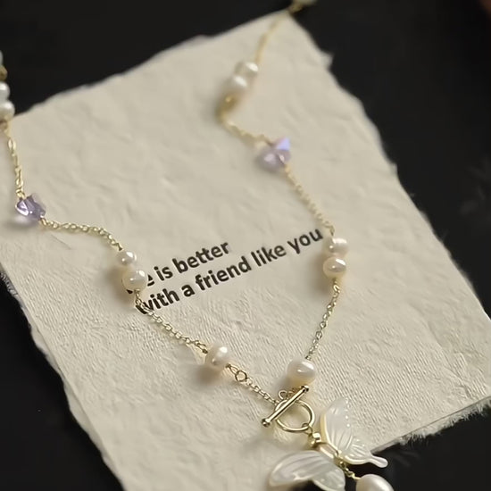 A delicate round freshwater pearl, with a charming butterfly-shaped pendant, symbolizing transformation and freedom. This necklace is crafted to enhance your elegance and remind you of your strength and beauty at every stage of life.
