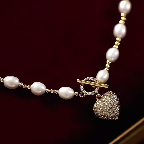 A timeless freshwater pearl necklace, featuring a delicate gold heart-shaped pendant. This piece symbolizes love, warmth, and the beauty of life’s most cherished moments. It’s perfect for women who embrace their journey, wearing their experiences with grace and elegance. A gentle reminder of the heart’s strength and the joy that comes with every chapter.