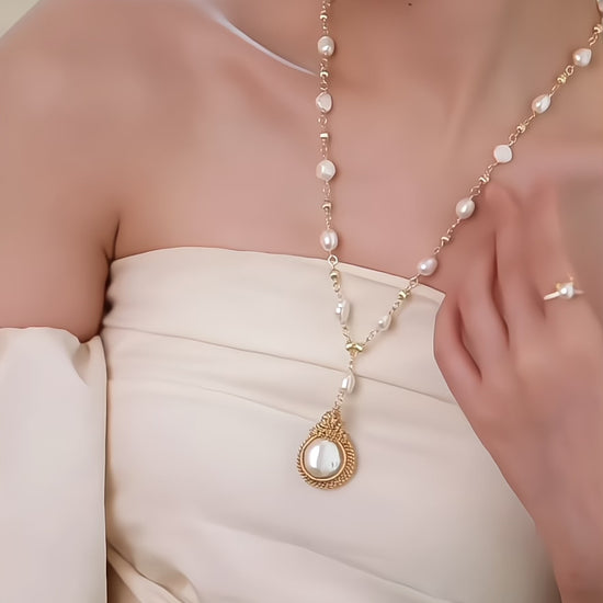 This stunning necklace combines the timeless elegance of freshwater pearls with the regal beauty of a Baroque pearl pendant. The intricate gold chain complements the opulence of the design, giving it a true royal touch. With its royal-inspired style, this piece is a celebration of grace and power, perfect for a woman who knows her worth and embraces her inner queen.